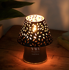 ハースウィック専用のシェード。鉄製のシェードのため、WoodWickの焚き火のようなパチパチ音が反響しやすくなります。熱が逃げにくくなり、中心だけが溶けていくトンネル減少を防ぐことができます。また、炎をカバーするので安全性もアップ!ランプのように見た目もおしゃれになります。オンラインショップはこちら